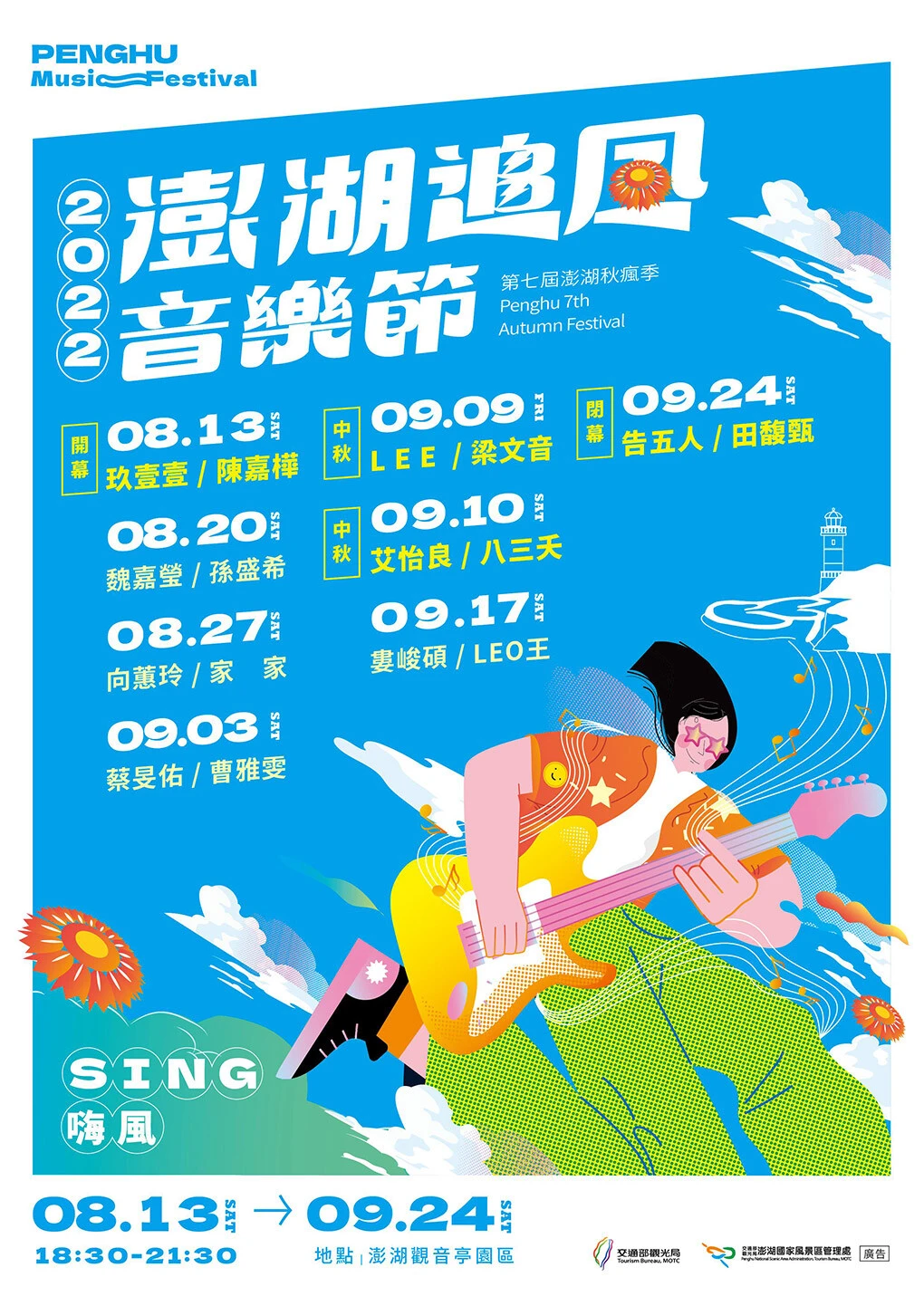 由交通部觀光局主辦的「澎湖海灣燈光節」,將於今年8月13日到9月24日,全新升級為「澎湖追風音樂節」,除了邀請到台灣重磅級歌手現場演出,還搭配由國內外藝術家在觀音亭以「澎湖好風光」為主題打造的繽紛浪漫光環境,讓大家可以在夏秋之際來到澎湖,邊聽音樂邊打卡,同時吹海風、嚐海味、瘋海洋!